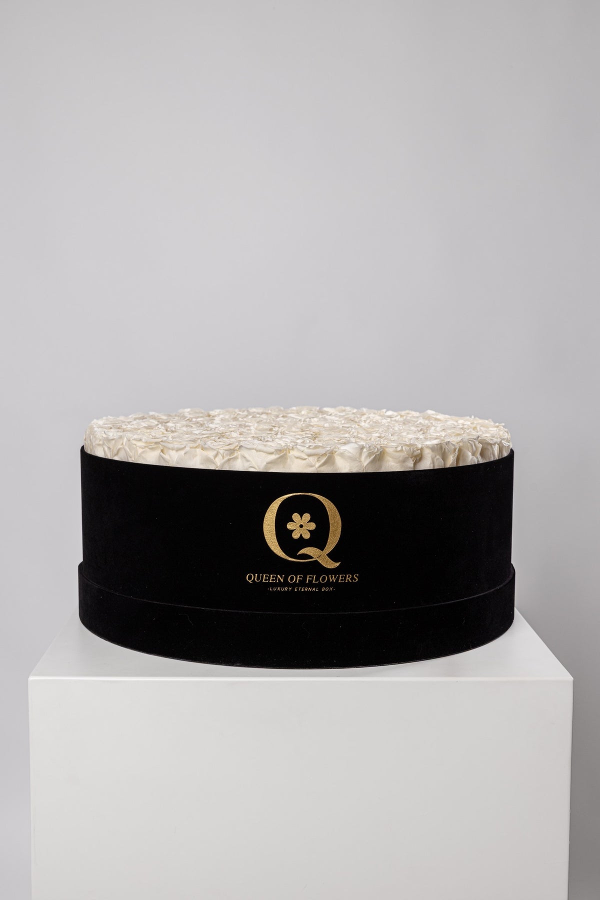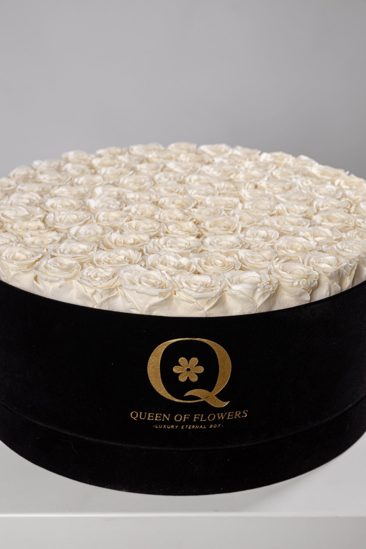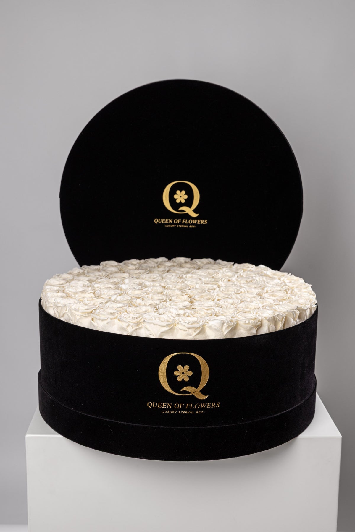 A true statement of purity and sophistication. Our White Eternal Rose Luxury Box features perfectly preserved ivory roses arranged by hand inside a deep black velvet box, creating a striking contrast that embodies elegance, prestige and timeless beauty. These roses maintain their flawless appearance for years, offering a luxury gift that never fades.