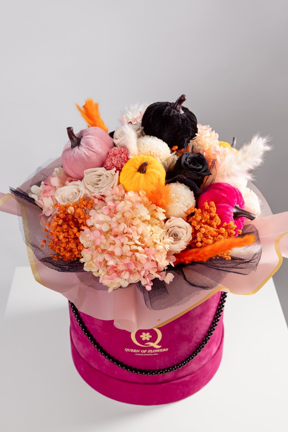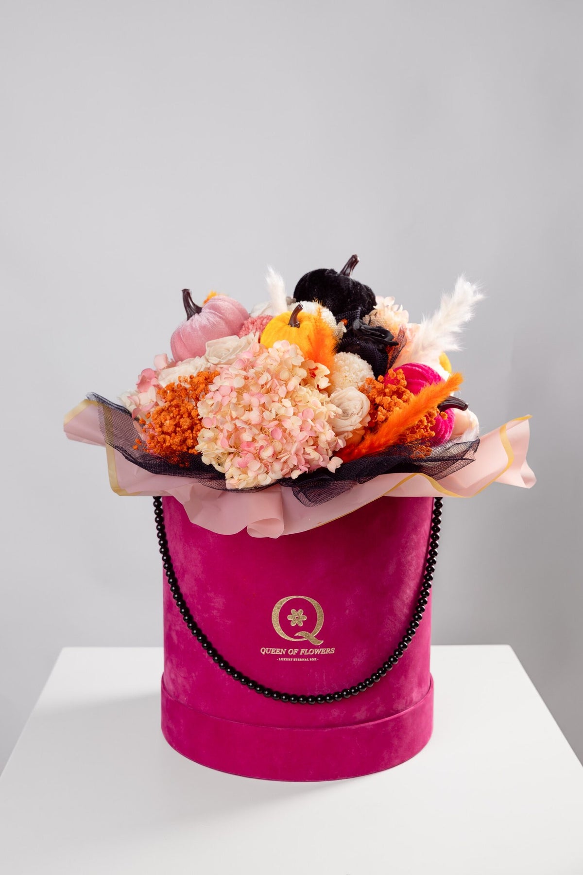 The bouquet is presented in the signature velvet Queen of Flowers bag in a bold fuchsia tone, creating a striking contrast with the soft seasonal colours of the arrangement. The velvet texture and gold emblem add a luxurious touch that makes this bouquet stand out as a decorative piece for modern homes, boutique interiors or festive autumn celebrations. It feels joyful, fashionable and full of personality, making it ideal for someone who loves expressive and stylish decor.