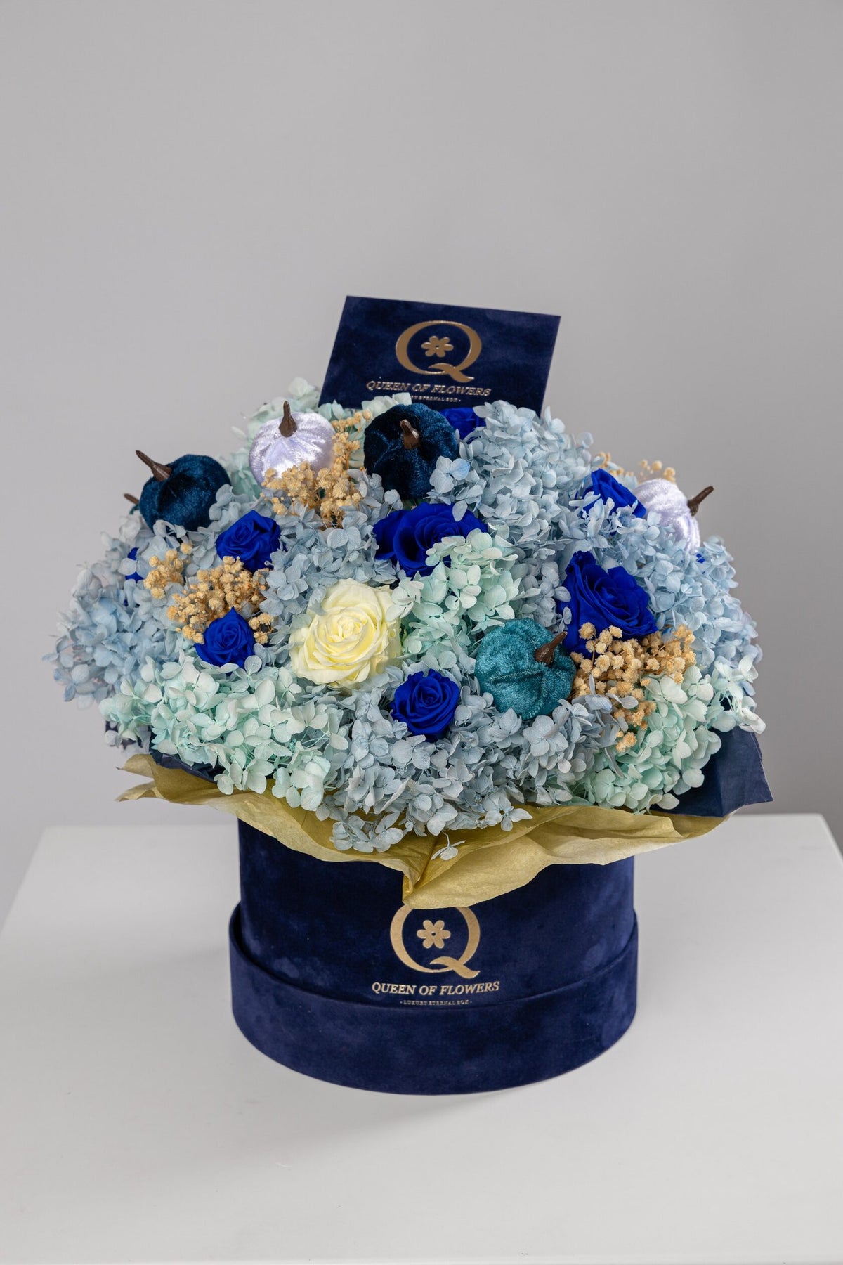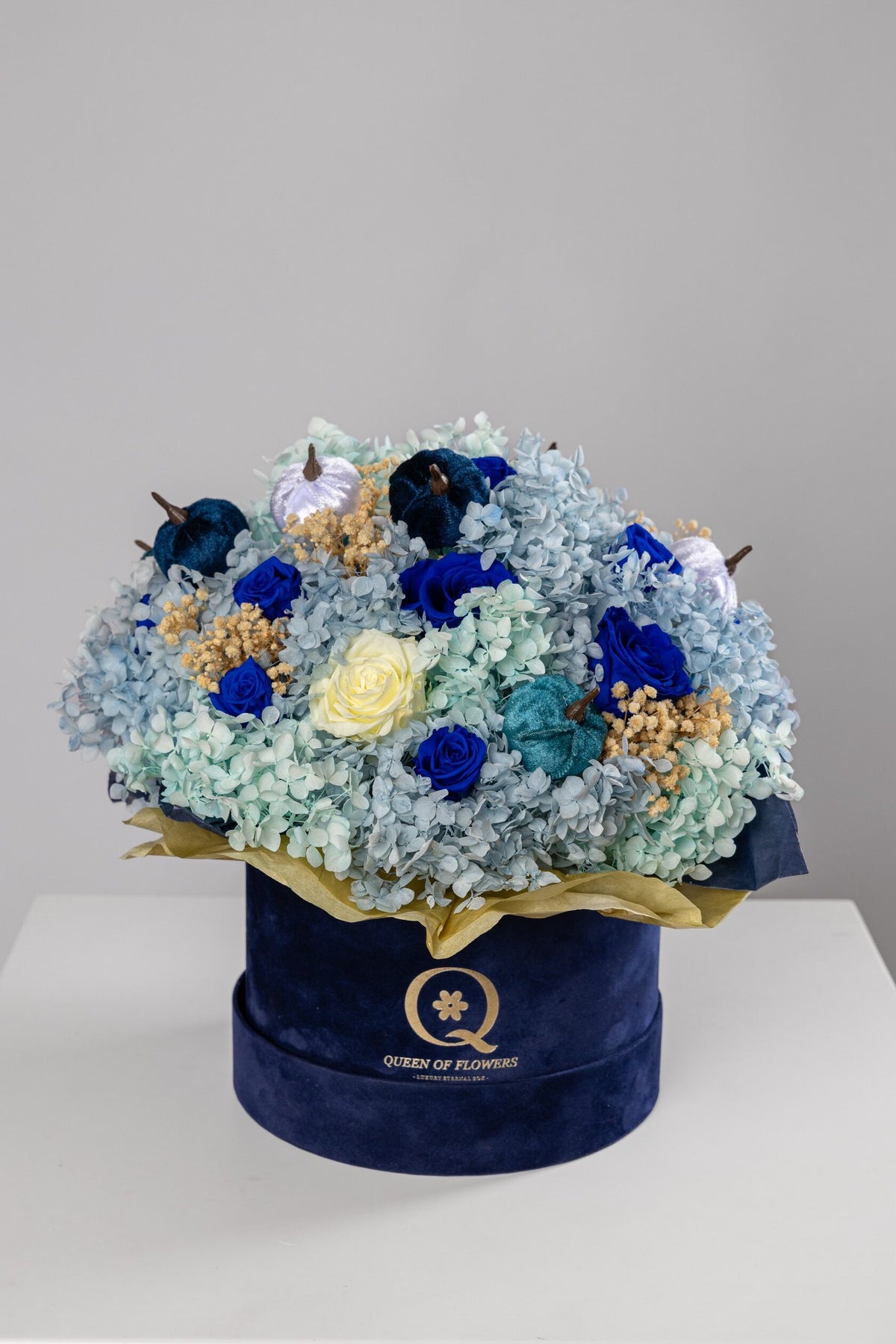 Eternal Autumn Elegance Box Blue and Gold Edition is a one of a kind composition that blends seasonal beauty with refined sophistication. This luxurious arrangement combines preserved blue and ivory roses with soft light blue hydrangeas and golden decorative accents, creating a rich and elegant look that feels both modern and timeless. Velvet decorative pumpkins complete the design and add a warm autumn touch that makes the piece stand out in any interior.